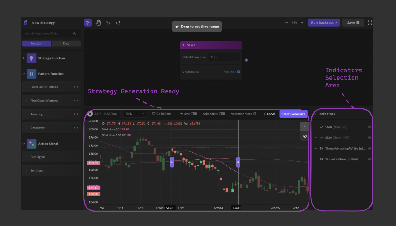 The Generate Strategy feature simplifies the process of creating strategies. Users can automatically generate strategies by selecting preferred timeframes and indicators or patterns through the Add Indicator feature in the stock chart interface.