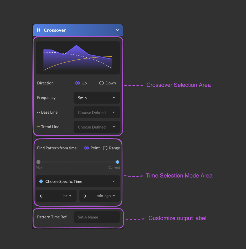 The Crossover function within Pattern Functions offers users the ability to analyze and capitalize on market trends by identifying key points of intersection between different datasets. This function provides users with customizable parameters to fine-tune their analysis and create actionable signals.