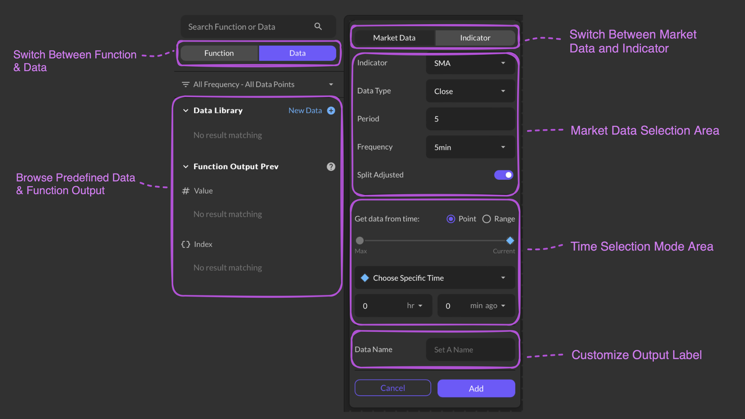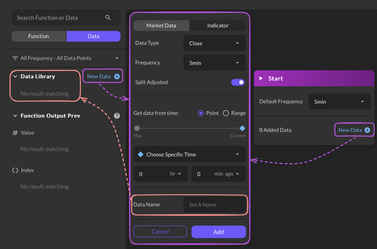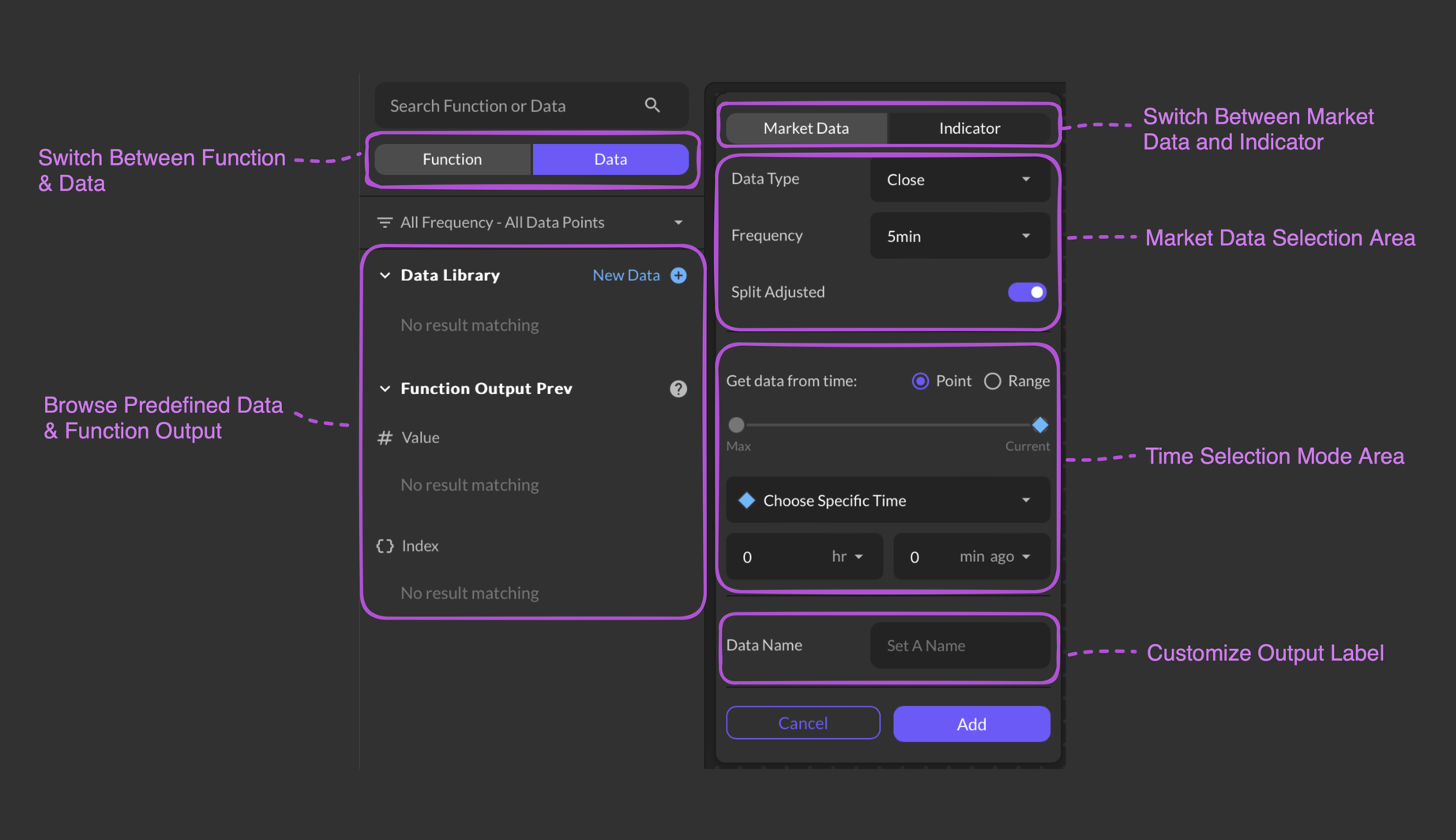 Accessible from both the Start Component and Data Library, the New Data button effortlessly leads users to the Data Setting Board. With Market and Indicator tabs, users can swiftly choose between market data or indicators, set preferred time frames, and define settings for an optimal strategy.