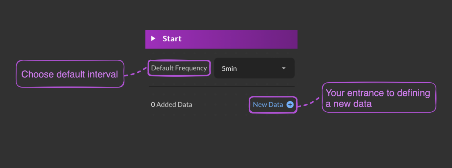 The default frequency in the “Start” component refers to a predefined frequency, such as 5 minutes, 15 minutes, 30 minutes, 60 minutes, or daily. By setting the default frequency, the frequency value in the “New Data” feature and subsequent functions would automatically synchronize with the preset default frequency.