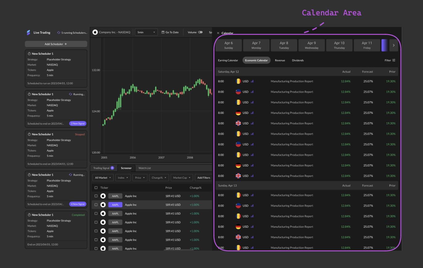 The Calendar feature in Watcher offers comprehensive insights into economic, earnings, revenue, and dividend events. It displays events occurring seven days before and after the current date, aiding investors in strategic decision-making. The Economic Calendar highlights key economic indicators and central bank meetings, providing forecasts, previous values, and actual data.Similarly, the Earnings Calendar showcases upcoming earnings releases for publicly traded companies, featuring expected and actual earnings per share (EPS) figures. Additionally, the calendar includes revenue events, indicating when companies are expected to report their revenue figures, and dividend events, marking scheduled dividend payments to shareholders. By staying informed about these events, investors can anticipate market movements and adjust their investment strategies accordingly.