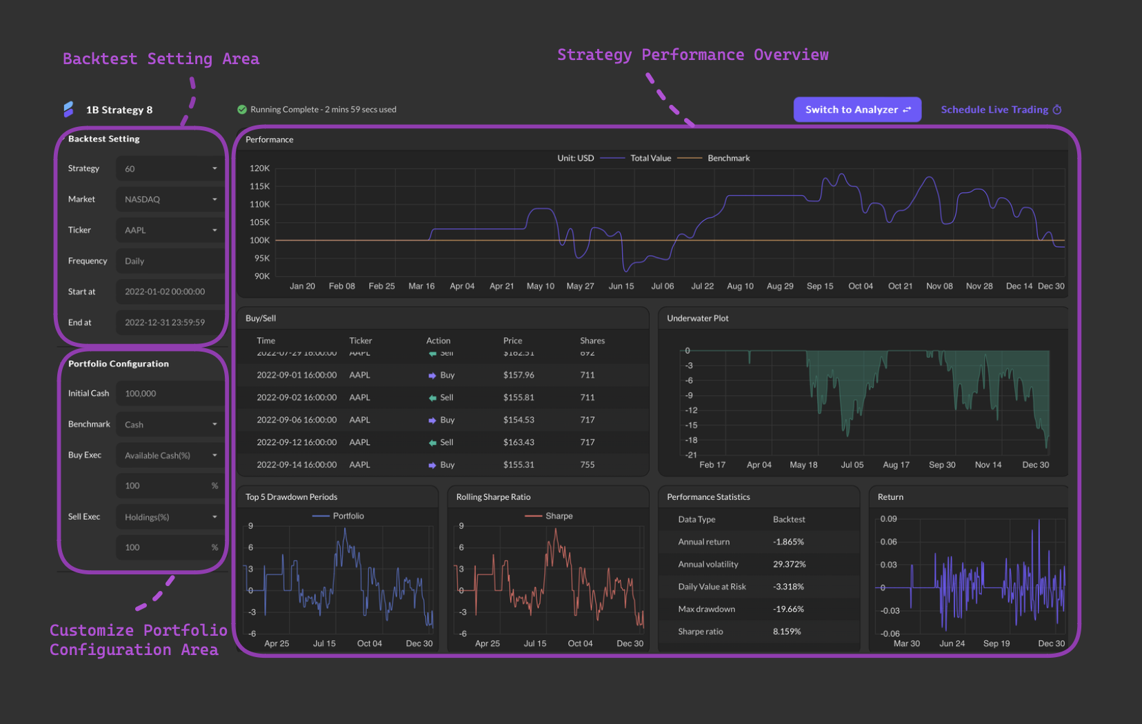 After completion, delve into the insightful analysis or plan to schedule a live trading session effortlessly. With Analyzer, gain deeper insights into your strategy’s performance and refine your trading approach with confidence. Additionally, seamlessly transition from analysis to action by scheduling live trading sessions directly from the platform.